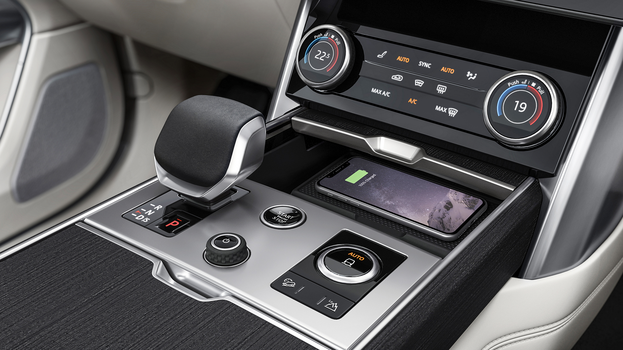 前排中央的挡把区域也变得更加平面化。此前捷豹路虎经常使用的旋钮式换挡,如今改成了更加常规的电子挡杆;中间是车辆启动按键和音量旋钮;右侧则是可以自动升降的全地形反馈系统旋钮,如果按下去就是默认auto自动状态。前方是带有推拉式盖板的储物格,同时也支持手机无线充电功能,上方则是由两块小液晶屏和旋钮、按键共同组成的空调控制区。