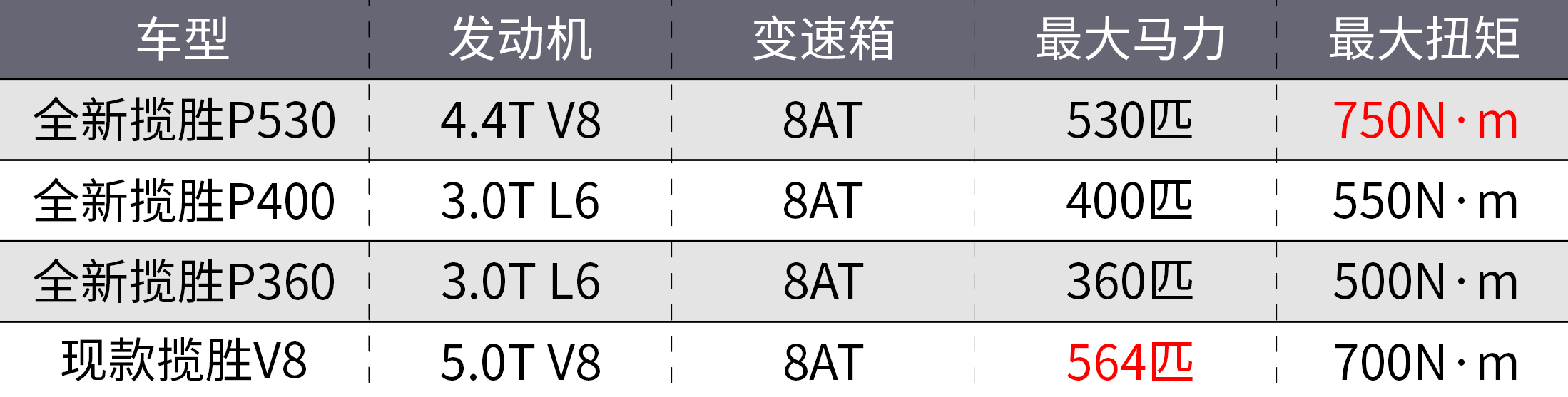 除了v8发动机外,全新揽胜还将根据配置、版本不同,提供3.0t直六汽油+48v、3.0t六缸柴油+48v,以及3.0t直六汽油phev插电混动系统。其中,3.0t汽油版应该是未来的主力车型,动力参数相比现款基本不变,虽然不如v8那么暴力,但也够满足日常使用了。