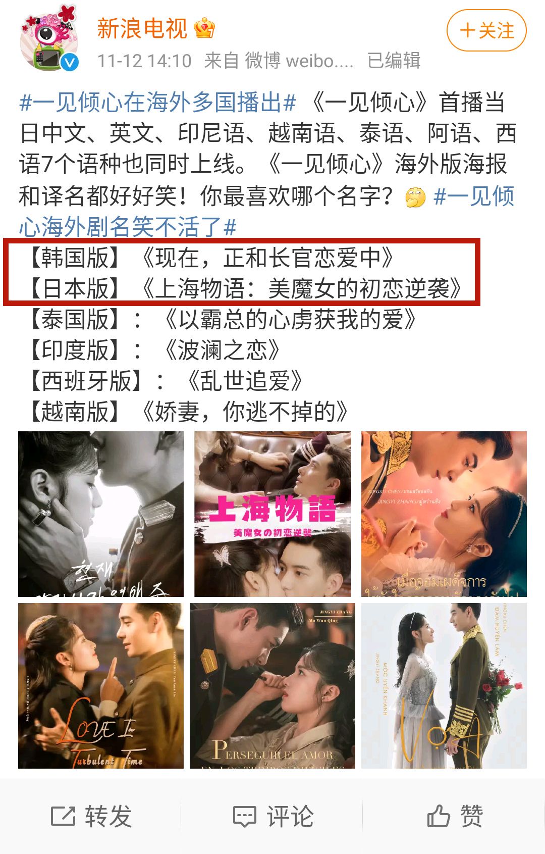 《一见倾心》除了在国内播出,还在日、韩、泰、越等海外六国上线,而该剧的海外版译名一经曝光,便惹得国人网友哈哈大笑。特别是日、韩两国的译名,的确具有当地特色:韩国译名《现在,正和长官恋爱中》;日本译名《上海物语:美魔女的初恋逆袭》。