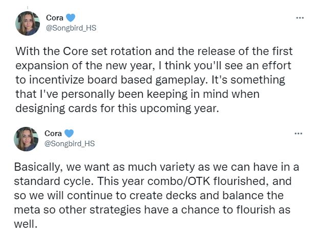 对于这个问题,cora在推特中表示,他们在过去几个月中,尽了最大的努力来降低组合技或者otk卡组在环境中的强度及表现。sara在最新一期的国服周报里,将任务手牌术放到了较高的位置,这个卡组目前的出场率和胜率不错,cora也同意使用“新卡能否击败任务术”来衡量每张新卡的强度完全合理。但他们会试图改变这种情况。