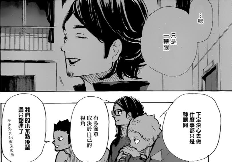 说到此处,我们的大地学长还不忘吐槽,“我们的小不点后辈过分豁达了”,可不是嘛——日向独闯巴西,西谷西游意大利。相比之下,我们其他人都的生活都太过于一板一眼、循规蹈矩了。