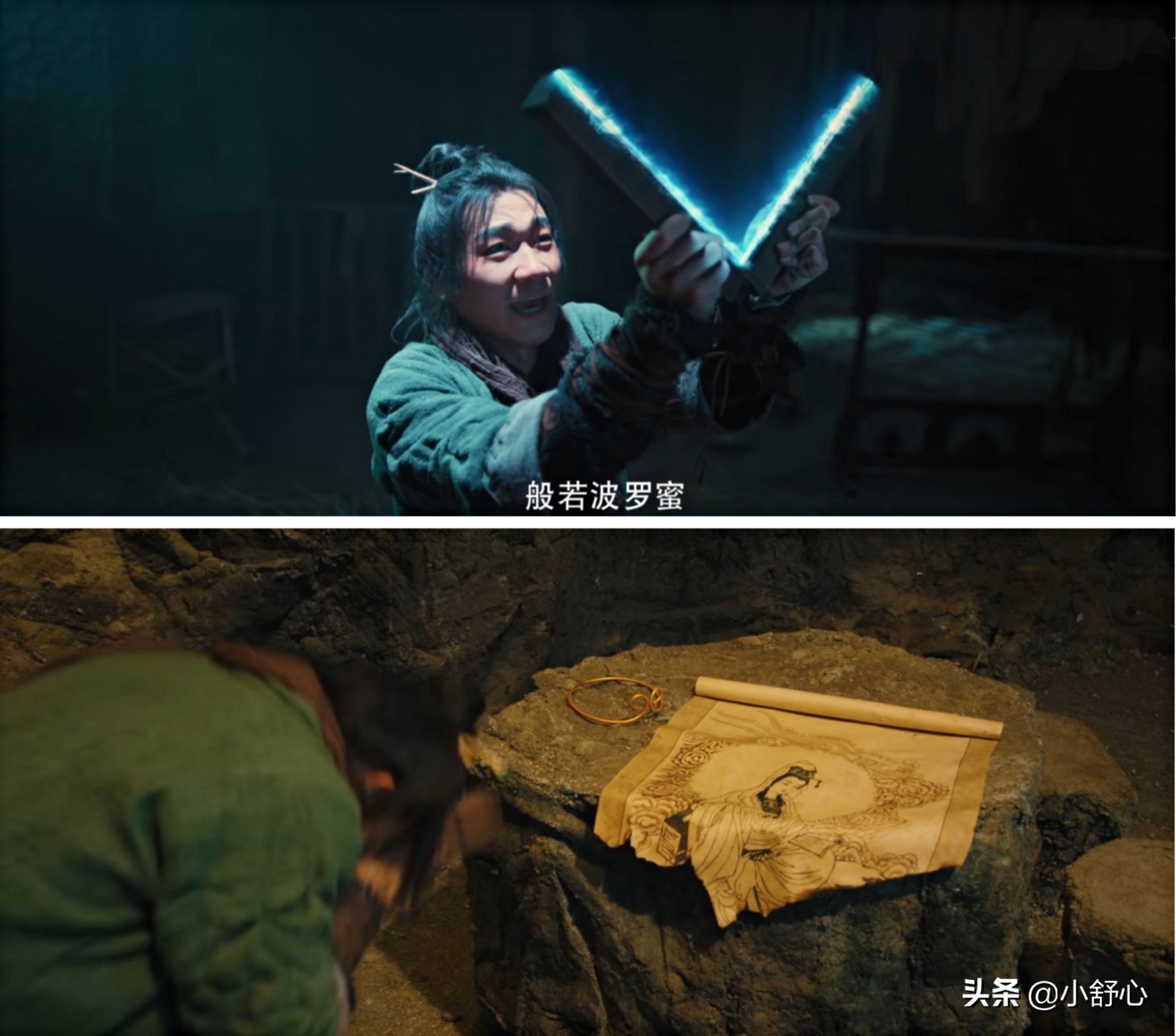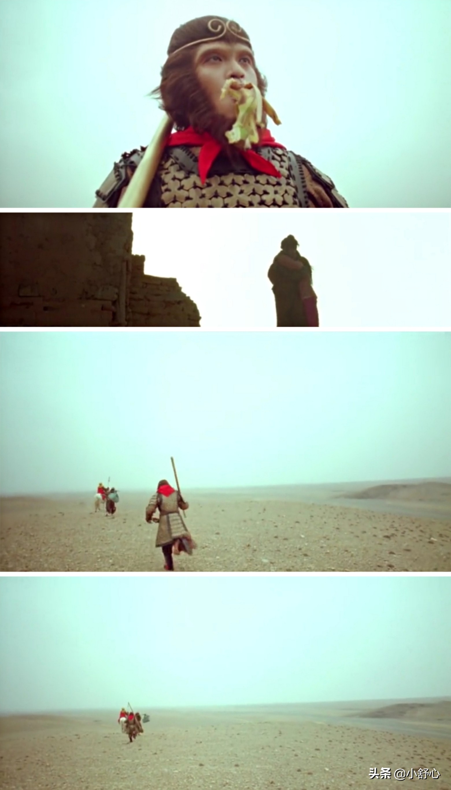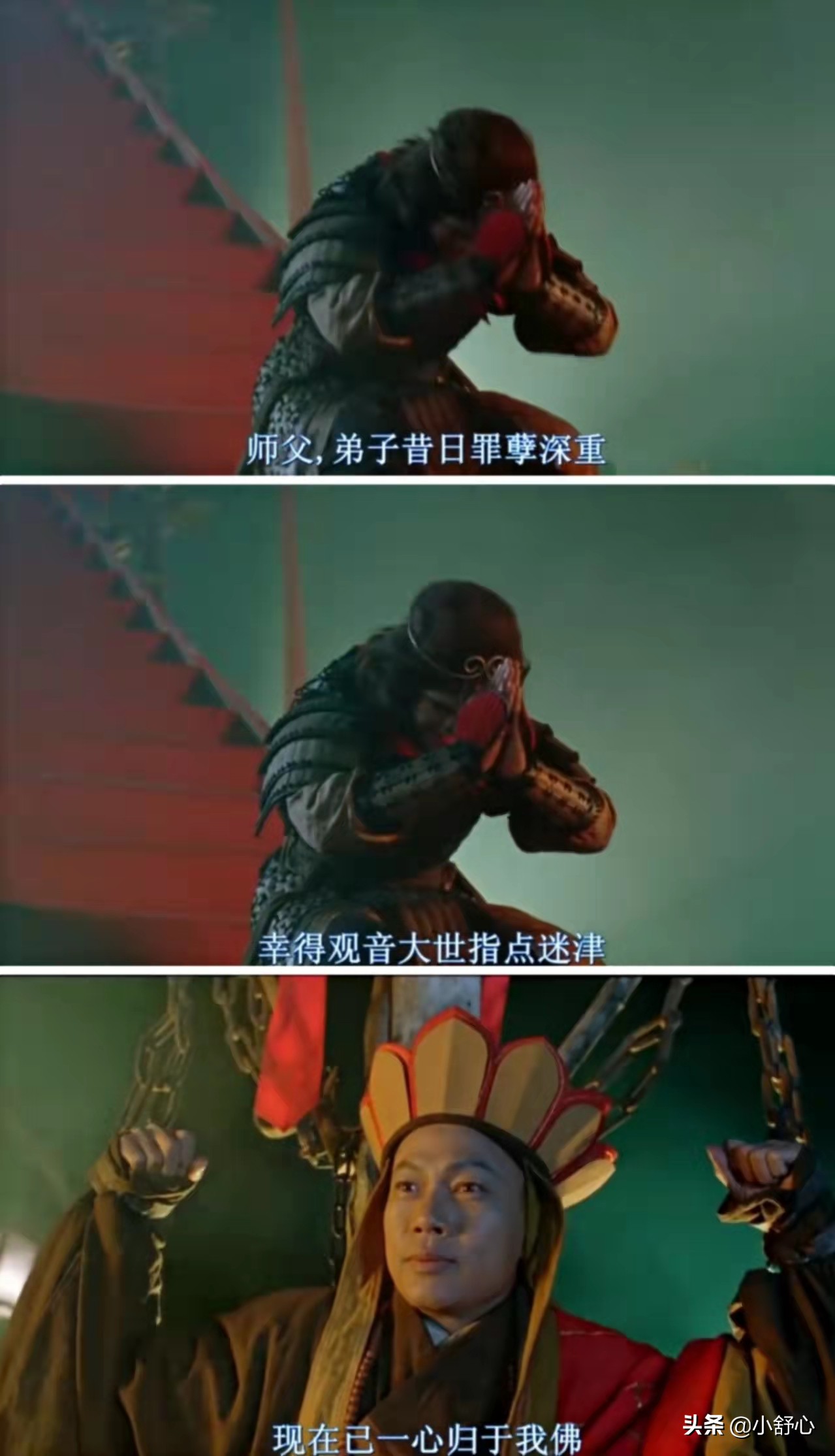 苏醒后的孙悟空好像置身于另一个世界,所有的人或物都变了样。他看到了菩提的化身而挨了前世所谓的三刀,看到了春三十娘和白晶晶的化身和睦相处,看到了至尊宝和紫霞的化身并且帮助他们紧紧相拥在一起后,他心事终了,和师父和师弟义无反顾地踏上西天取经的征程。
