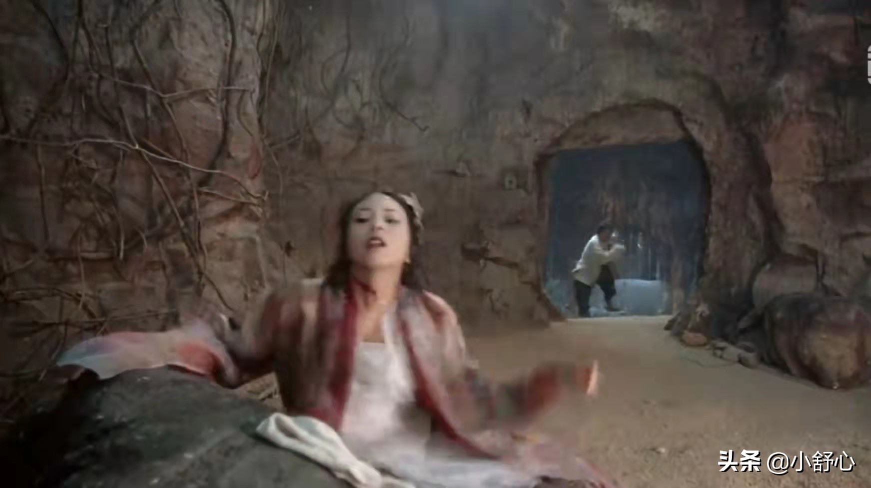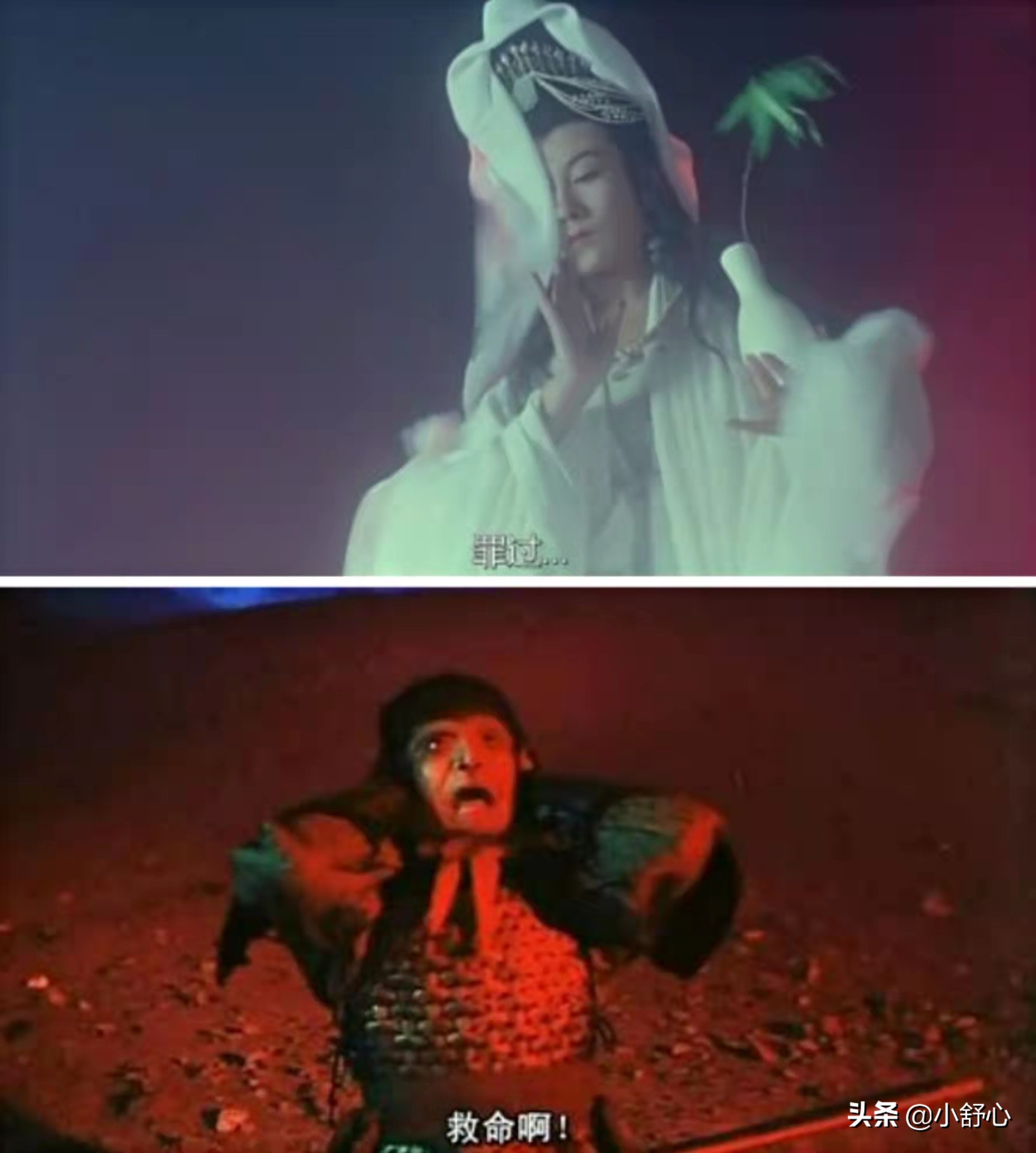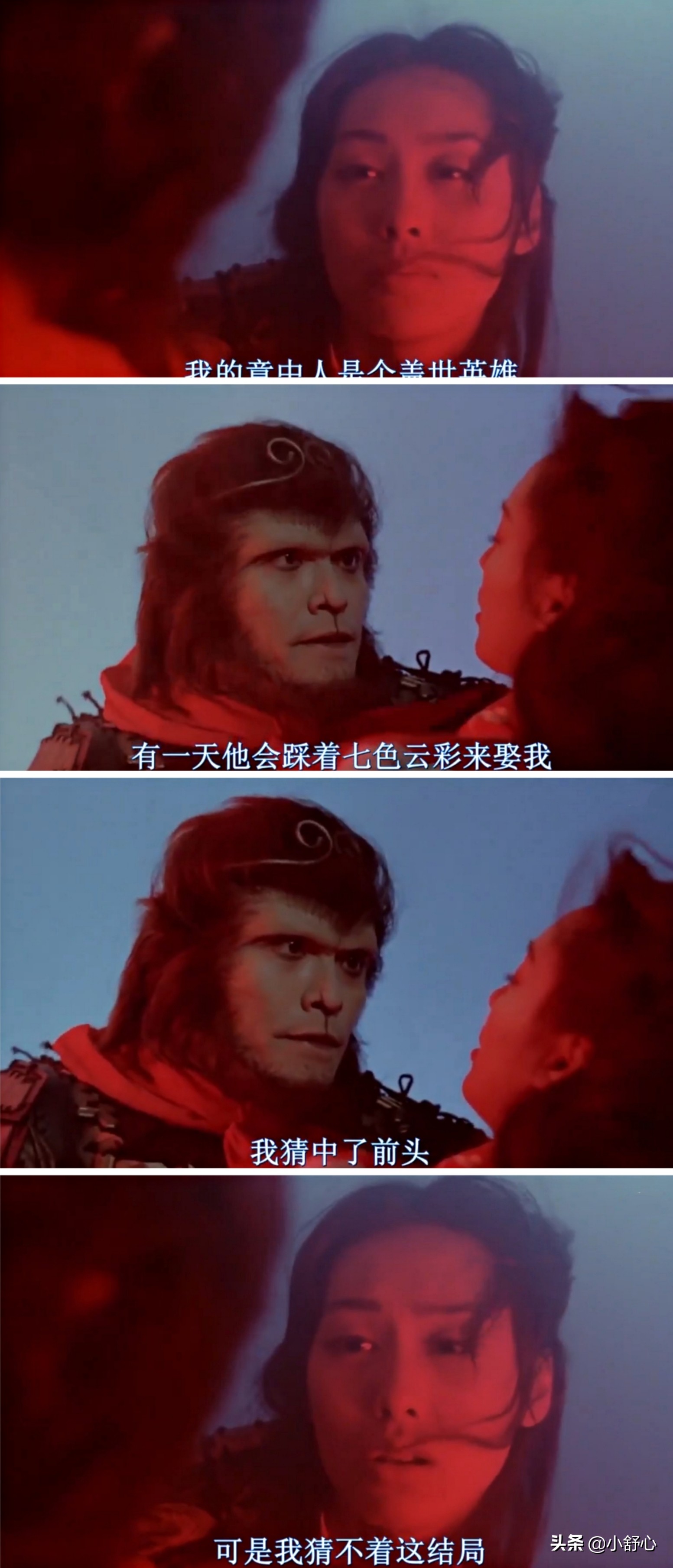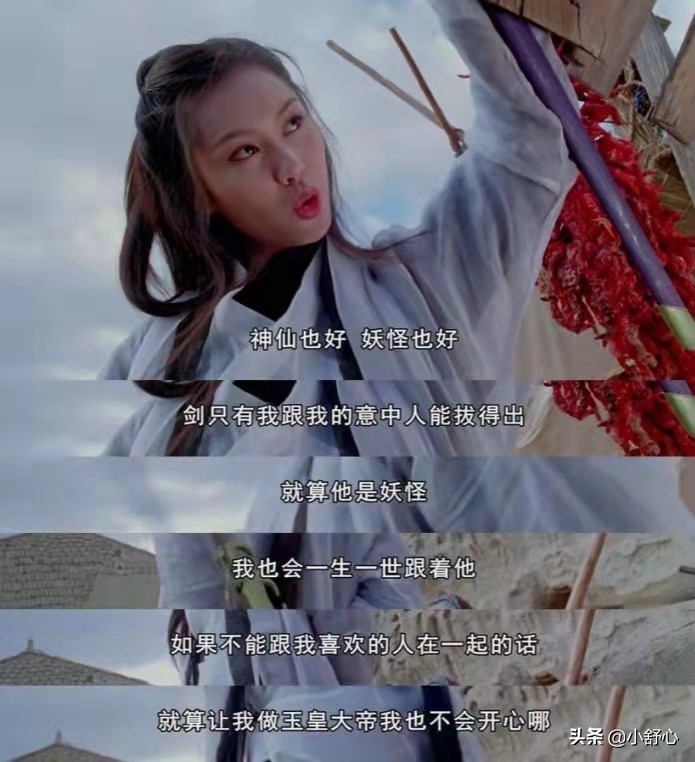 紫霞临死前,说出了那句经典:我的意中人是个盖世英雄,有一天他会踩着七色的云彩来娶我……