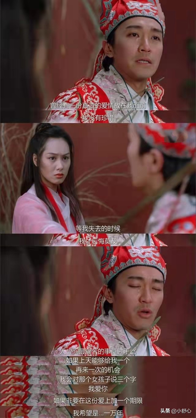 这时铁扇公主来了,与牛魔王纠缠在一起,至尊宝趁机来到紫霞身边,为了骗她偷取月光宝盒,撒谎说爱她,于是就有了第一次那段经典的话:曾经有一份真诚的爱情摆在我的面前……