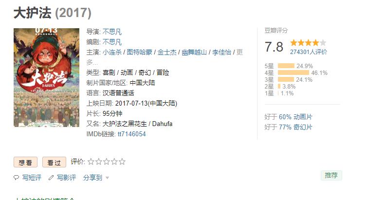 《大护法》是2017年上映的一部国产"动漫影片",从开始的豆瓣评分6.1到最后的7.8,可见影片还是非常受欢迎的,而同时作为被重新定义"国产动漫"的引导者,确实备受关注。