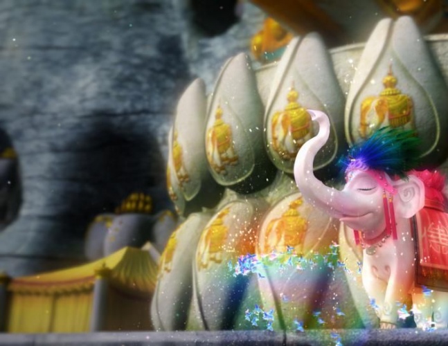 赛象大会上云集各国大象,白象女神“妙妙丹”在出场时的五光十色,惊艳四座,在大象的世界里展现出当之无愧的女神气质。白象之舞的段落,作为国产动画片从视觉效果来看可圈可点,足以让观众们一饱眼福。当然,从小朋友们的视角来看,有女神班花自然就会有仰慕女神的吊车尾,“林旺爷爷”年少之时是不是也对女神心生向往?它又是否会向妙妙丹表白?在一旁虎视眈眈的象王“崑”又会把林旺如何处置?在曝光的海报中,每一个动物角色的眼神都各有故事,暗流中涌动着各种可能。