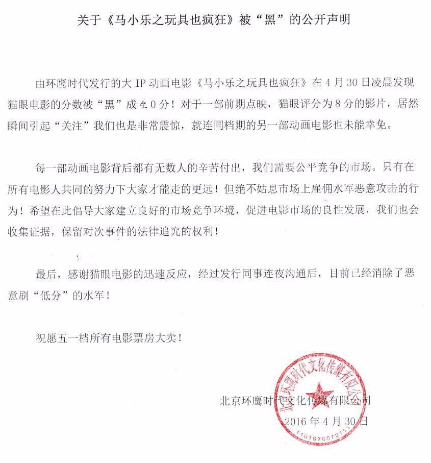 每一部动画电影背后都有无数人的辛苦付出,我们需要公平竞争的市场。只有在所有电影人共同的努力下大家才能走的更远!但绝不姑息市场上雇佣水军恶意攻击的行为!希望在此倡导大家建立良好的市场竞争环境,促进电影市场的良性发展,我们也会收集证据,保留对次事件的法律追究的权利!