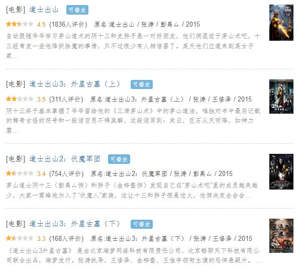 再比如陈凯歌导演的《道士下山》15年7月才上映,同年4月片方就抢先上线了《道士出山》——一连“出”了四部;同年,另一位导演上线了两部《道士降魔》——讲道理,做道士真的很辛苦啊!
