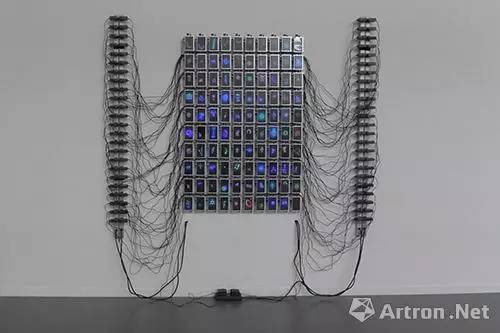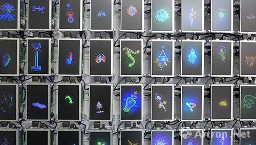 塔博尔?罗巴克(tabor robak)作品《蝴蝶房》由10x10网格状排列的100个小型显示屏组成,每个显示屏配以专用微型电脑播放虚构的细胞生物体动画。生物们随着时间变换形态,改变颜色,愈加复杂。不断变化的视觉内容,纯粹的视觉盛宴赋予了这件作品奇妙和活力和真正的生命力。