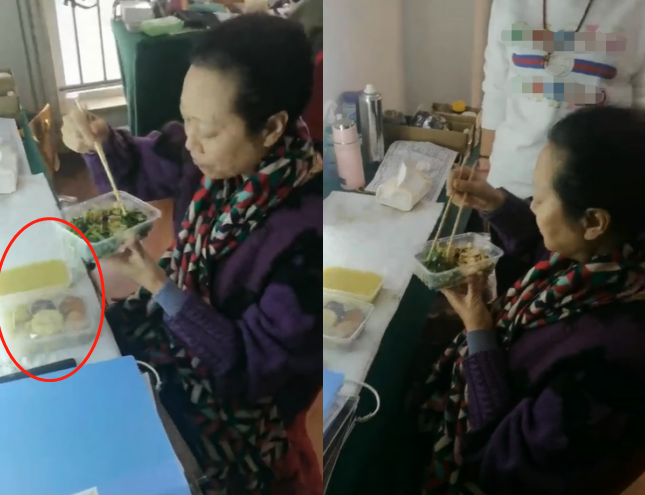 王丽云坐在休息室,穿扮依旧低调简朴,镜头中她正在拿着一盒素菜不停地往嘴里塞,桌上还摆放着一份面点和小米粥。