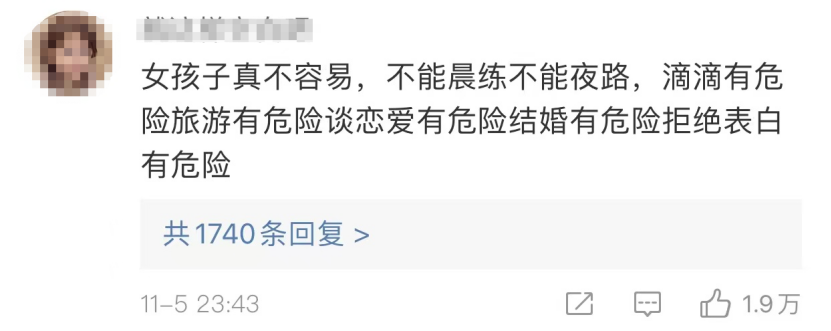 “女孩子真不容易,不能晨练,不能夜路,滴滴有危险,旅游有危险,恋爱有危险,结婚有危险,拒绝表白也有危险。”