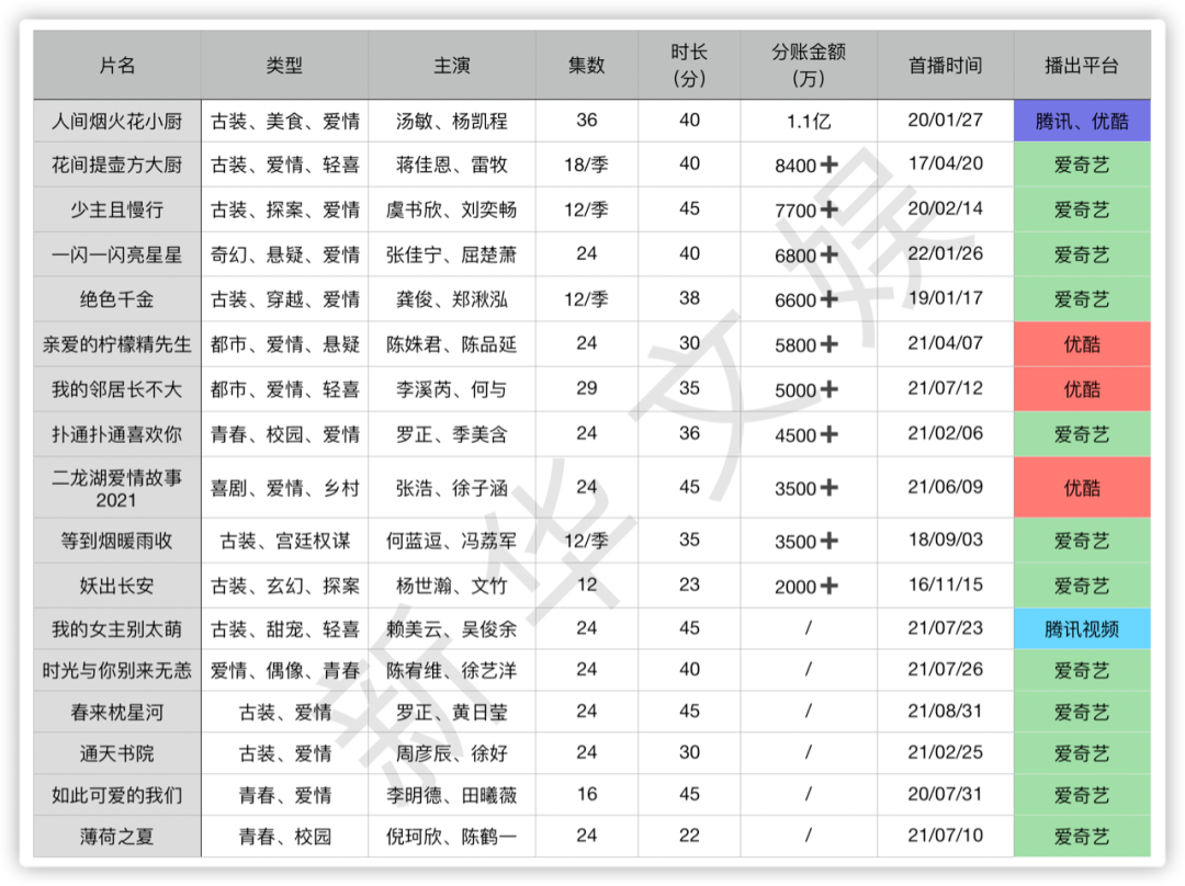 观察近年分账剧市场“成绩单”:2016年,楼氏影视、森林影画、北青传媒联合出品的古装玄幻网剧《妖出长安》以500万元成本斩获2000万元分账收益;17年,新圣堂影业出品的爱情美食网剧《花间提壶方大厨》两年间累计分账收益超过8400万元;19年,映美传媒出品的古装偶像网剧《绝世千金》跟播期分账收益突破6600万元;再到20年,《人间烟火花小厨》更是将单部剧的分账票房顶上亿元水准,是迄今为止的数据天花板。