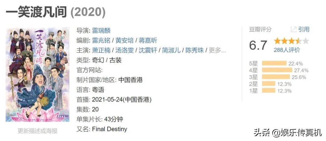 从口碑来看,《一笑渡凡间》没能成为像《金宵大厦》那样的黑马,该剧的豆瓣评分稳定在6.7分左右,算不上特别差,但也不高,对于一部小制作来说,完全砸不出什么水花。