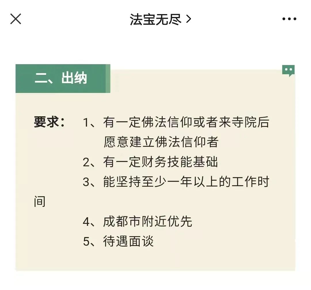 梳理多家寺庙官微发现,除了光孝寺,广东六榕寺、上海玉佛寺、江苏法宝寺等都招聘过财会相关职位。例如2017年,玉佛寺发布了一则招收财务主管的需求。招聘启事写得很佛系,未注明具体岗位要求。有读者留言询问年龄区间,回复也很有禅意:无年龄限制,只需「有信仰,有梦想,有情怀」。单就这一点,对「35岁焦虑」缠身的都市打工人来说真是极其友好。