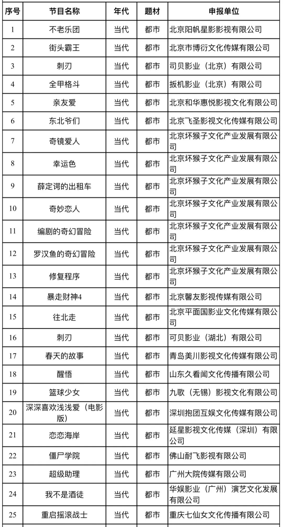 都市题材:北京博衍传媒《街头霸王》、海南未伊文化《拳击少女》;农村题材:通辽奇点影视《边草无穷》、山东奥梦传媒《树上童年》;青少题材:北京乾现影视《琉璃》、北京视博映画《逐梦少年》;革命题材:青岛新梦场《奇袭白虎团1953》、怀宁长传《铁血女枪手》;公安题材:南京戎盛影业《危险证据》、深圳叁鑫文化《追凶神探之新人林秋浦》;科幻题材:北京凌云飞扬传媒《异次元代码》、海南奇点降临影视《外星异客1》;传奇题材:北京帧好传媒《九天玄女之如意宝册》、深圳杰影传媒《重生哪吒》;武打题材:北京新影联盟传媒《康熙擒鳌拜》、北京华济金谷传媒《女海盗之怒海营救》;其他题材:河南电影电视制作集团《唐宫夜宴》、浙江坤势影业《民间捞尸人》等。