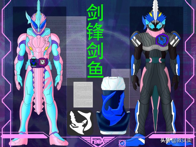 ?剑锋剑鱼:使用剑鱼印章变身,这是根据圣刃旗鱼形态设计的,致敬的是假面骑士剑锋,变身形态类似圣刃驱动器的一册形态,头上的剑刃变成了剑鱼造型,顶端是锯齿状,胸部盔甲则是大号的剑鱼,锯齿一样的嘴巴非常大。组合搭配还不错,如果将胸部的剑鱼盔甲替换成剑鱼长剑应该更好,估计是画师太懒了。