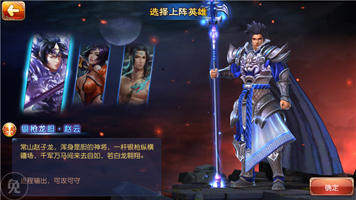 在选择完除了长相并无其它差异的召唤师头像后玩家会进入到相对重要些的上阵英雄选择界面。本作中可供玩家选择的有赵云、花木兰以及阿飞三个角色,他们有着不同的职业自然属性也有很大的差异。赵云用银枪、阿飞拿神剑,都是近程输出可攻可守,而花木兰则拿弓箭擅长远程,玩家在做决定时定要考虑自己的擅长部分。