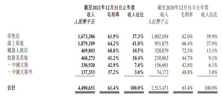 渠道方面,泡泡玛特2021年的收入中,18.79亿元来自线上,同比接近翻番;零售店收入16.73亿元,机器人商店(售货机)收入4.7亿元,批发收入4.45亿元,展会收入2.35亿元。
