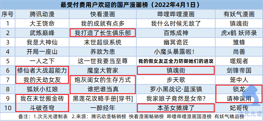 哔哩哔哩漫画方面,玄幻搞笑漫画《我什么时候无敌了》登顶榜单,漫画由创易文化出品,改编自戏柳先生的同名小说。截至4月1日,漫画连载了53话,平台评分9.2分,阅读指数161.6万、作品总月票数累计为3.66万张。