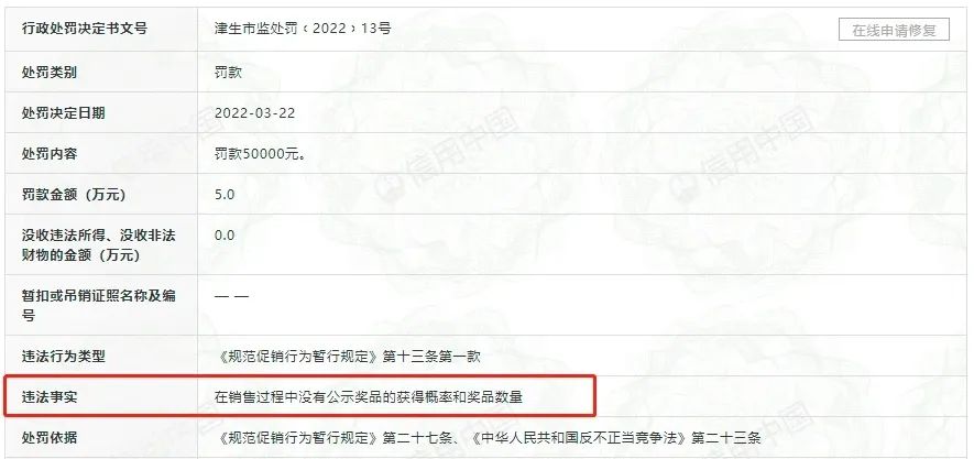 3月31日消息,天津泡泡玛特文化传播有限公司(北京泡泡玛特文化创意有限公司全资子公司)近日新增一则行政处罚,处罚事由是在销售过程中没有公示奖品的获得概率和奖品数量,违反《规范促销行为暂行规定》第十三条第一款,因此被罚款5万元。
