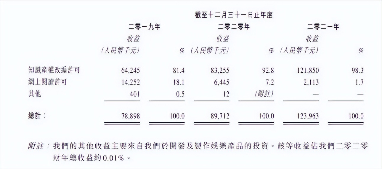 2018-2021年,恺兴文化的网上阅读收入分别为1960.1万、1425.2万、644.5万和211.3万元,改编授权收入分别为4154.9万、6424.5万、8325.5万和1.22亿元,授权收入的占比越来越大。