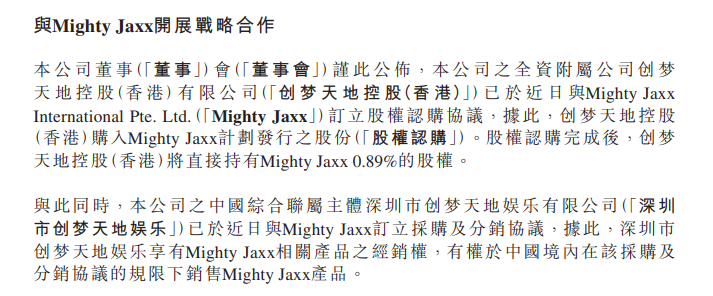 3月28日,创梦天地发布公告,将投资新加坡潮玩公司mighty jaxx,持股0.89%(按2亿美元估值,投资金额超1000万元)。同时,创梦天地还与mighty jaxx签订了采购及分销协议,前者将享有后者相关产品的经销权,并且有权在国内采购及分销合约下的mighty jaxx产品。