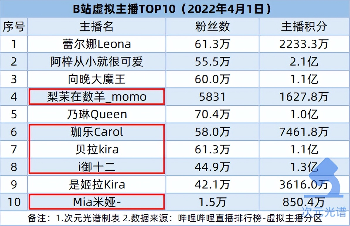 其中,a-soul的“珈乐carol”、“贝拉kira”分别排在第六、七位,截至4月1日,在b站有分别有58万粉丝、61.3万粉丝。