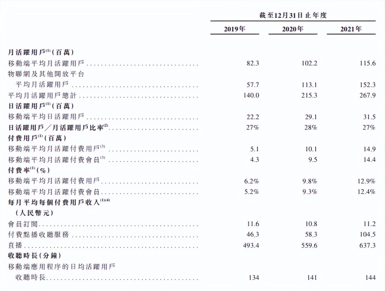2021年,喜马拉雅的平均月活跃用户达到2.68亿,其中包括1.16亿移动端平均月活跃用户和1.52亿通过物联网及其他开放平台收听喜马拉雅音频内容的平均月活跃用户。