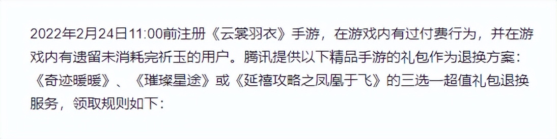 此外,《云裳羽衣》在停服公告中还给出了补偿方案,将玩家在游戏中剩余的虚拟货币以及虚拟服务,退换为腾讯提供的《奇迹暖暖》等三款手游的自选礼包。