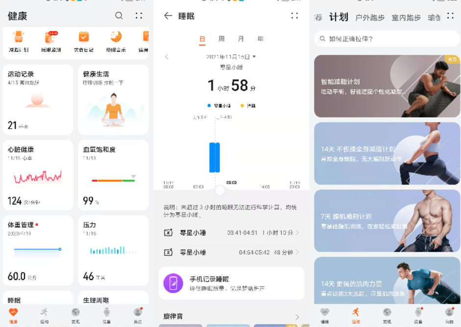 华为watch gt runner在连接了华为运动健康app之后,我们可以直接观看到详细的心脏健康、血氧饱和度、睡眠、压力、体重等数据,还有非常详细的数据分析以及健康指导意见,内置了跑步、骑行、瑜伽、健身、跳绳等11种类型的训练内容,并提供了超过300节精选课程,真正做到了让数据为我们的健康服务,才能称得上私人健康管家。