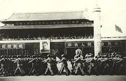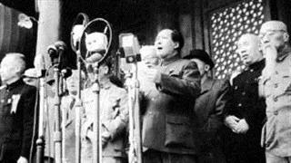 1949年10月1日,北京30万军民聚集在天安门广场参加开国大典。毛主席向全世界庄严宣告:“中华人民共和国中央人民政府今天成立了!”在《义勇军进行曲》的雄壮旋律中,新中国第一面五星红旗冉冉升起。全场肃立,向国旗行注目礼。广场上,54门礼炮齐鸣28响,象征着中国共产党领导全国各族人民艰苦奋斗28年的光辉历程。