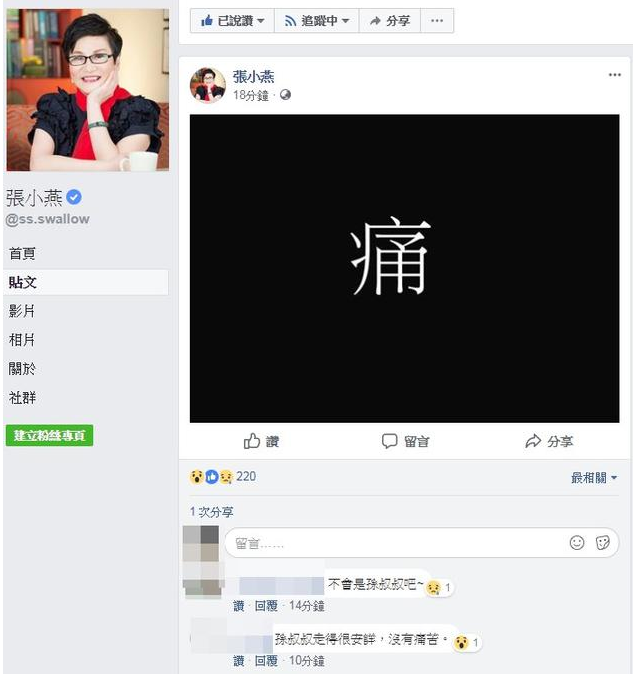 知名艺人张小燕证实孙越病逝,并在脸书po文表示哀悼↓