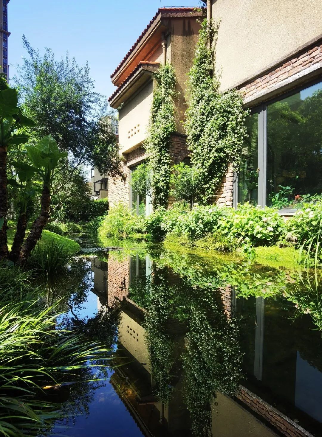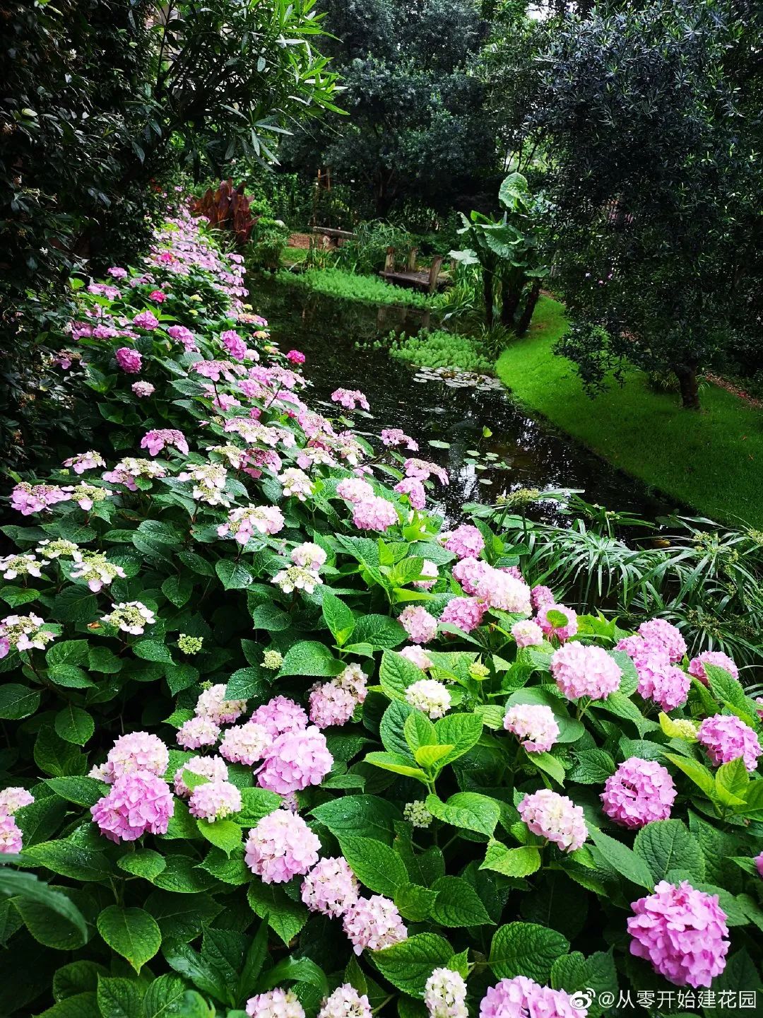 5月份是侧院最佳观赏期,一岸是绿树成荫,一岸是密密匝匝的绣球临水盛放,波光粼粼,影影绰绰。
