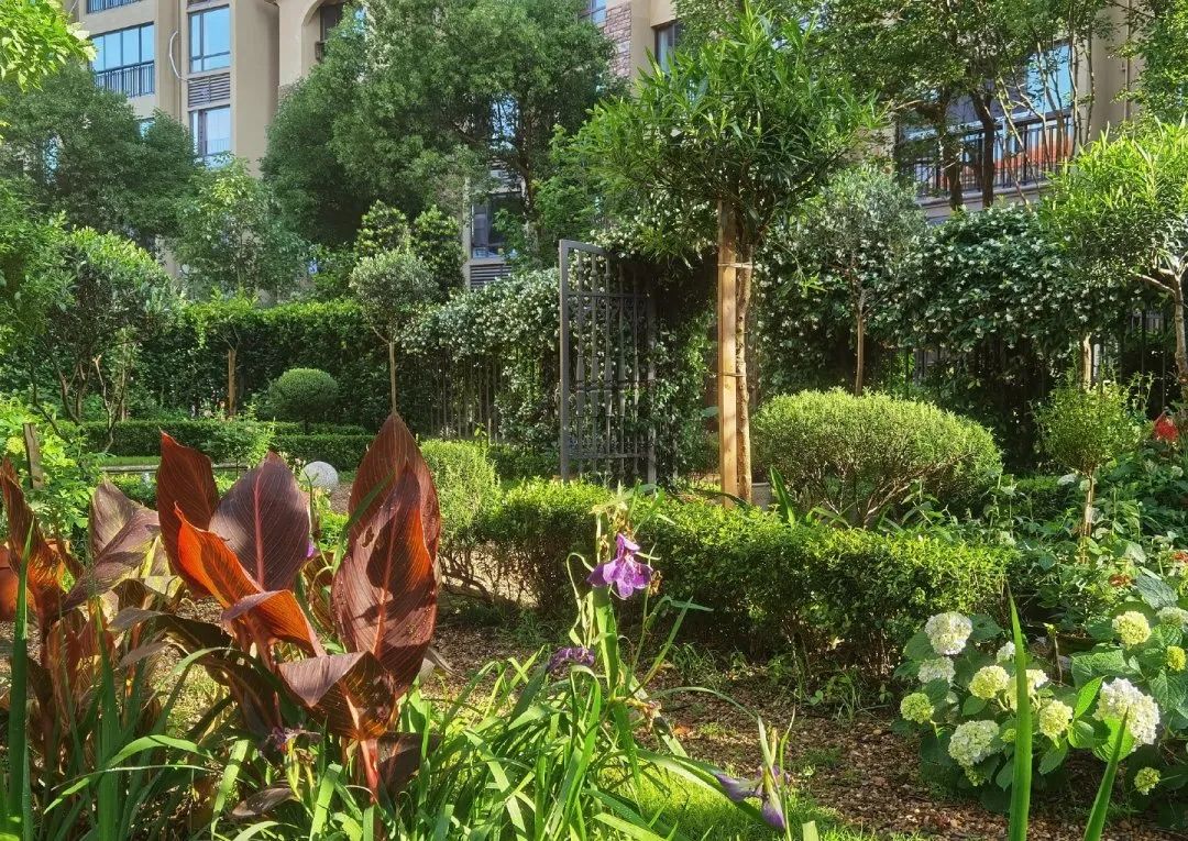 靠近房子的一岸,种满了绣球、落新妇、夹竹桃、紫叶美人蕉、大丽花等植物;另一岸董先生夫妇种了许多观赏乔灌木和观赏绿植,像麻球、橄榄树、滴水观音等,靠近围墙的区域,则种了不少金银花、风车茉莉等爬藤植物。