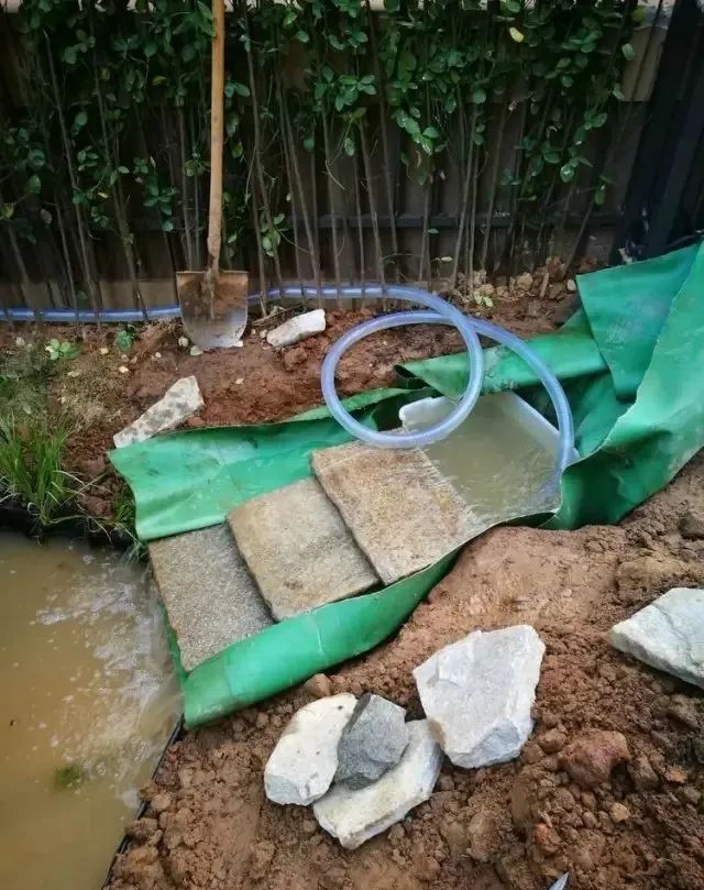 3、不要急着铺小石子下去,等水位完全调整平了,土压实了,没有任何漏的再铺,准备补漏胶带,万一漏了有对策