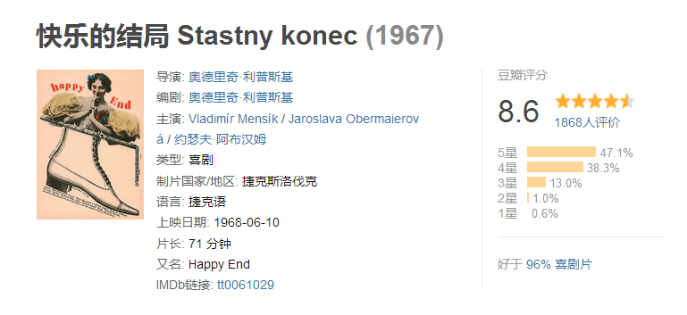 对于这部影片,我真的是难以评价,使我留下深刻印象的不是本片的剧情或者说拍摄手法有多复杂,而是本片居然从头到尾全部都是逆向拍摄的!大概的剧情我记得是讲一个人从出生到成年再到结婚后由于某个原因害死了妻子到最后法庭审判至执行死刑。但由于影片全程是逆向拍摄的,所以我们看到的最开始情节是主角被执行死刑时的苦难再到最后才是主角的出生时全家的快乐的情形。最令人疯狂的是,全片所有演员的行为动作,场景配乐,甚至连对白都是反着呈现的!我们能看见倒着走路的人,死刑犯由死复生,先听到对话中的答案,然后下一秒才得知别人问话的内容!实在是不可思议,你能想象一部70分钟的影片倒着看的感受吗?如果你没有一点反向思维能力和耐心,估计很难看完此片。这是电影史上独一无二的一部完全逆向呈现的故事长片,我也实在猜不透懂导演为什么要这样拍片,也许他认为只有在人刚刚出生的那一刻才是真正快乐的结局吧。导演奥德里奇.利普斯基虽然不属于捷克新浪潮的一批,但在捷克电影史上是一位很有创新意识的剧情片导演,他1964年的讽刺剧杰作《雷蒙纳多.乔》被誉为最经典的捷克电影之一,然而他所有的影片之中唯有这部影片是最具独特的。但仔细想一下,如果导演当年没有这一大胆的创举,按常规电影正常时间顺序播放的话,那么这部电影也就是普普通通的一部电影,可能现代人没有人会知道它的存在。