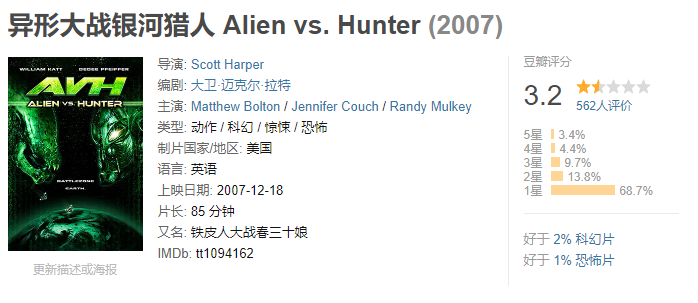 8.山寨《异形大战铁血战士》------《异形大战银河猎人》豆瓣评分3.2分