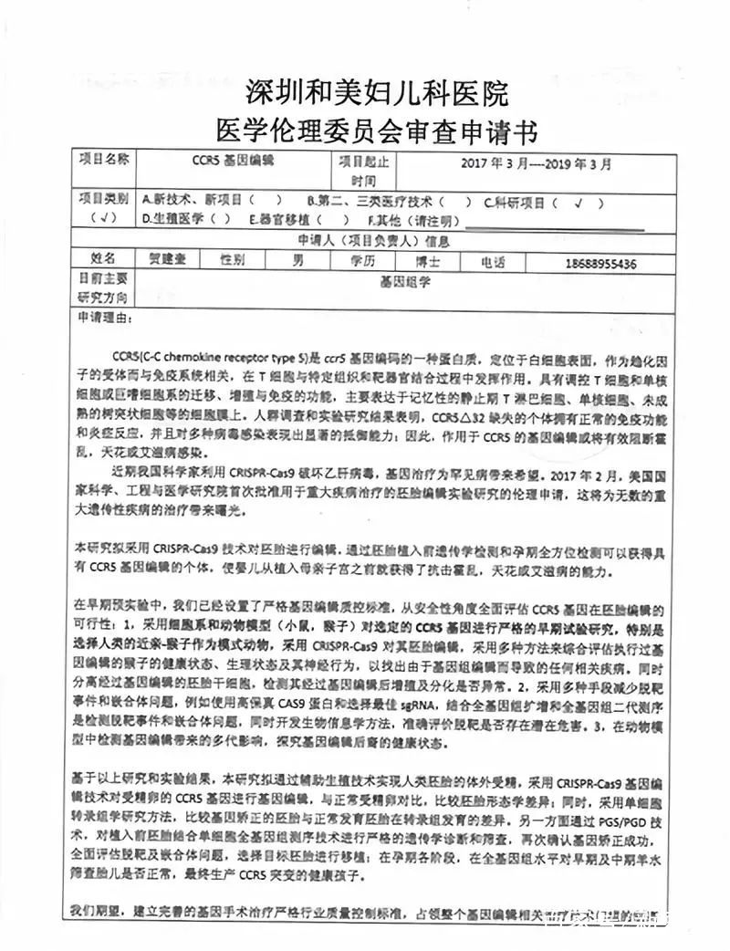 深圳和美妇儿科医院总经理程珍昨日告诉记者,自己看到了网传的《深圳和美妇儿科医院医学伦理委员会审查申请书》,但该项目不是在医院做的,孩子也不是在医院出生的。“医院和贺建奎没有过合作,他的实验和医院没有关系。”程珍表示,自己从未见过贺建奎,医院正在对该事件进行调查。