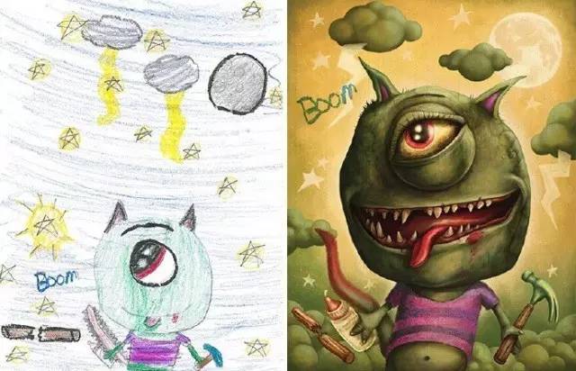 这项活动是与美国德州的一所小学合作,让在校学生以“怪兽”为主题创作。然后将这些作品送至世界各地参与此次计划的画师手上,用他们的风格重绘这些孩子的怪物,接着再将这些更加生动的怪物送回到小学生的手中。