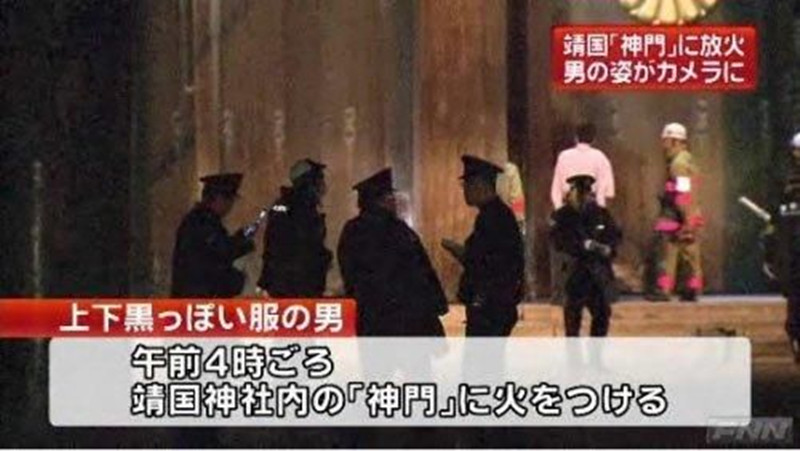 他将准备好的汽油泼在神社的基座和顶部的日本国徽上,用打火机点燃,瞬间火势大起,靖国神社被大火包围。