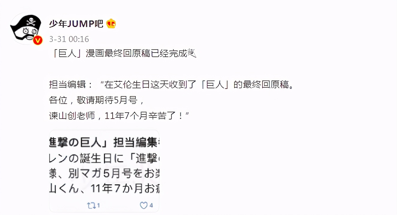 3月31日,《进击的巨人》漫画作者谏山创向编辑部提交了最终话原稿。