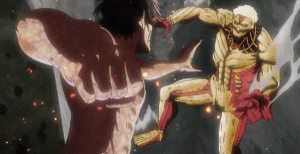 艾伦体内潜藏的巨人力量被激发,变身成了可以与巨人对抗的「进击巨人」。