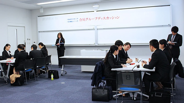 (在前台登记身份后领取考号、计算用的铅笔和草稿纸,进入考场后找到自己的位置,可戴耳机防噪音,答题过程中不许说话,每道题都有时限,电脑自动计时。考完后安静退场) web test之外,有些行业(例如新闻出版业)还有专业性测试,不仅考察语言能力和算数应用,还考察一般常识(政治、经济、国际关系、社会、科学技术、文化体育、地理历史等)、写作能力(作文、写词等)。《何者》中的两个年轻人参加某大广告公司的笔试,时间长达五个小时,其中便包括创作能力的考查。 笔试通过之后大多是gd(即小组讨论)的选拔(也有一些公司跳过这环直接面试)。几个人一组,围绕某个题目进行讨论,各抒己见后得出结论。讨论中需要有计时者和最终发表者,所以参加gd的学生大都会戴手表。整个讨论过程由公司相关人员旁观并打分,讨论结束后给于适当的反馈或提问。