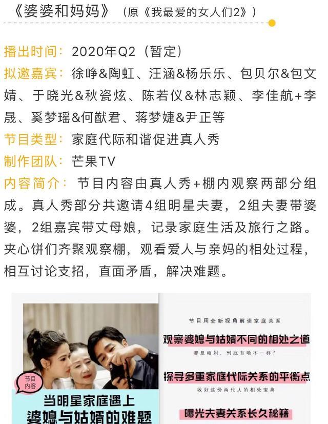 在今年的1月份,芒果第一与第二季度的综艺规划物料就被曝光,其中就包括了《乘风破浪的姐姐们》与《我最爱的女人们2》。不过《我最爱的女人们2》改名为《婆婆和妈妈》,当时的拟邀嘉宾就包括了李佳航与李晟。