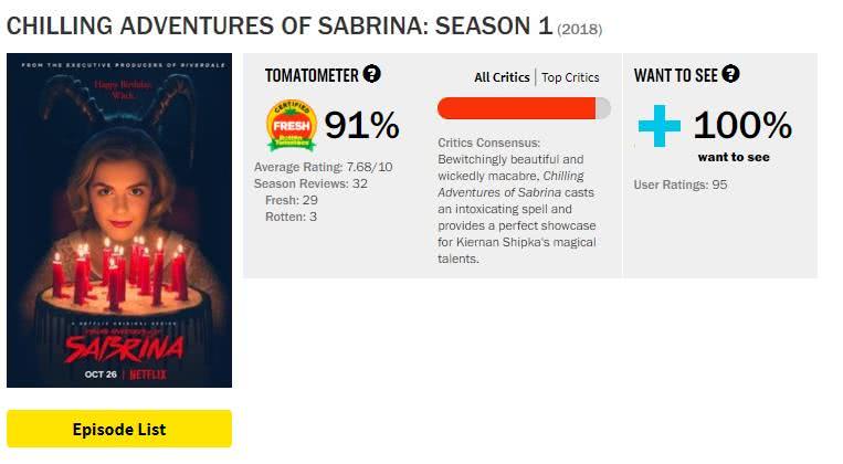 在烂番茄评分网站上,电视剧获得了29鲜3烂,91%新鲜度的评价。对于一部漫改电视剧来说这个分数已经相当不错了。在这部电视剧当中,曾经出演过《神探阿蒙》《广告狂人》等作品的琪兰·席普卡将出演女主角萨布丽娜,罗斯·林奇、米兰达·奥托、露西·戴维斯等也将在电视剧中出演重要角色。