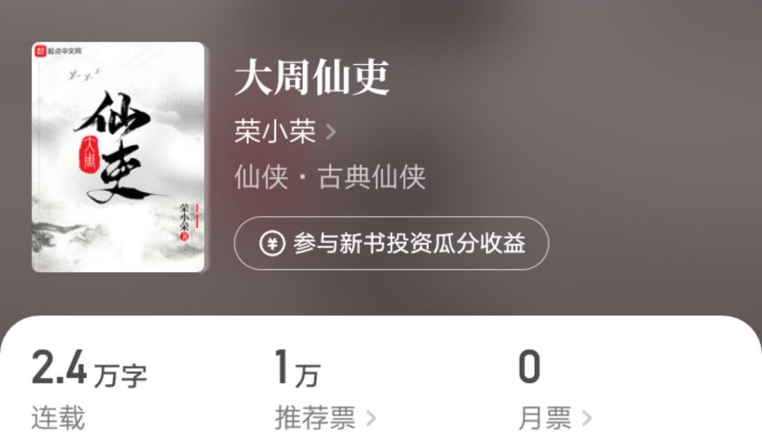 6月10号,历史类的大神荣小荣在起点上传了自己的这本新书。不过不是他擅长的历史题材,而是以架空历史为背景古典仙侠文。算是他以往作品《如意小郎君》的仙侠版。