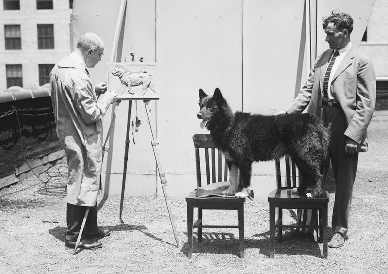 【图10】雪橇队将抗毒素血清接力送达,对扼杀白喉病起到了至关重要的作用。当他们在2月1日胜利抵达诺姆镇的时候,小镇中白喉病的感染人数已经达到了28例。但他们所送达的抗毒素血清足以治愈这28人。图为1925年7月14日,美国雕塑家弗雷德里克·罗斯(frederick roth)正在为“最后一棒”的领头雪橇犬巴尔托制作雕像。