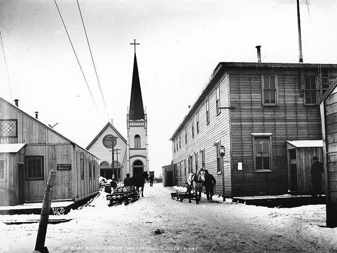 【图3】1924年,诺姆镇唯一的医生韦尔奇发现医院库存的白喉抗毒素血清已经过期,于是又从外地订购了一批。但是由于冬季到来,大雪封山,这批血清要到第二年春季才能运达。到了12月,韦尔奇医生诊治了几名儿童,最初认为是喉咙肿痛或扁桃体炎,但是这种病极具传染性,相继有四个孩子不治身亡,韦尔奇医生越来越怀疑这种病是白喉。到了1925年1月,他终于将一名三岁的男孩儿确诊为白喉病例,该男孩在患病两周之后就去世了。他给另一名患病的女孩儿使用了过期的白喉抗毒素血清,但是没能起作用。眼见一场白喉传染病即将爆发,形势开始变得严峻起来。图为20世纪初的诺姆镇。