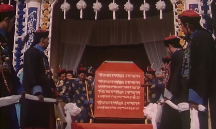 电影的一开始,导演通过了一段长达8分钟的镜头,展现了清朝时期,妃子下葬时的相关礼节、程序。