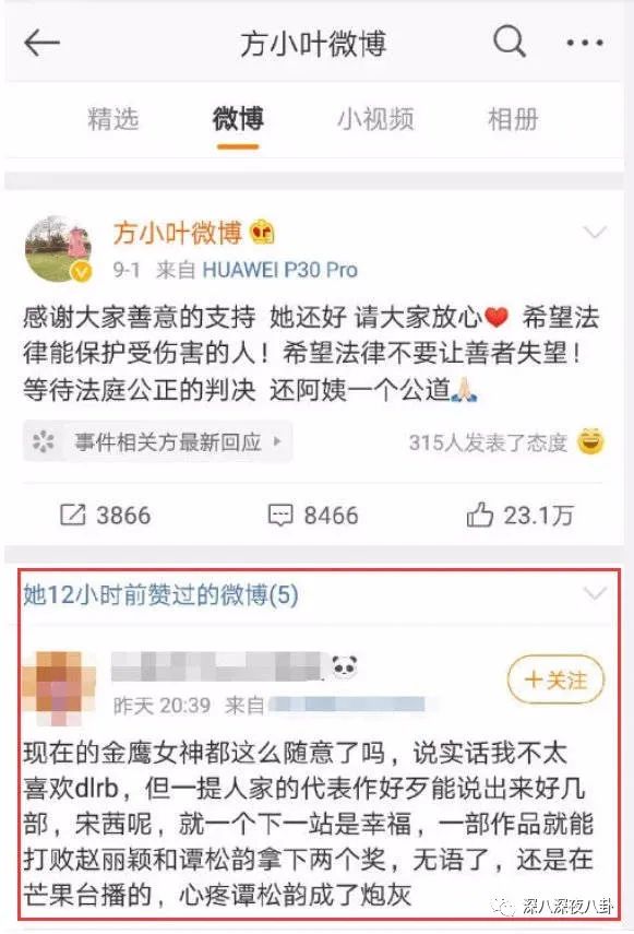 而昨天恰巧是金鹰女神投票的最后一天,谭松韵的经纪人方小叶前一天晚上点赞了一条diss宋茜的微博。